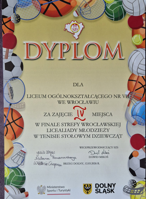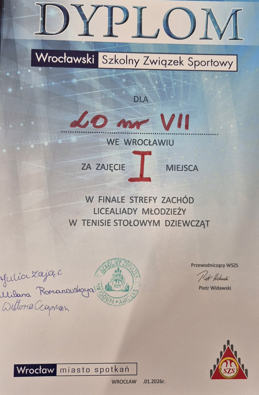 Finał Strefy Wrocławskiej w tenisie stołowym odbył się 13 marca 2026 r. w Brzegu Dolnym w hali sportowej MOSiR. W zawodach wzięło udział 8 drużyn, reprezentujących najlepsze szkoły z poszczególnych stref. Po zaciętej rywalizacji reprezentacja LO nr VII zajęła IV miejsce, co niestety nie pozwoliło na awans do finału dolnośląskiego, będącego kolejnym etapem rozgrywek.