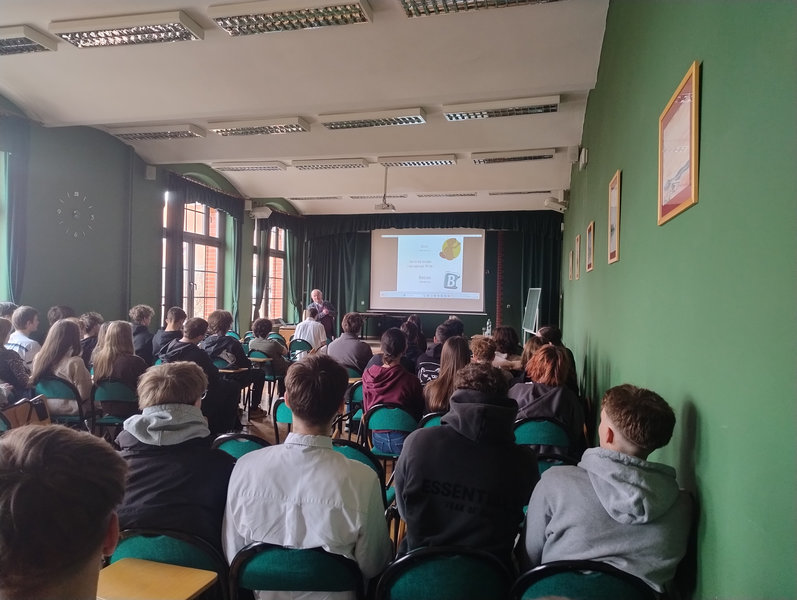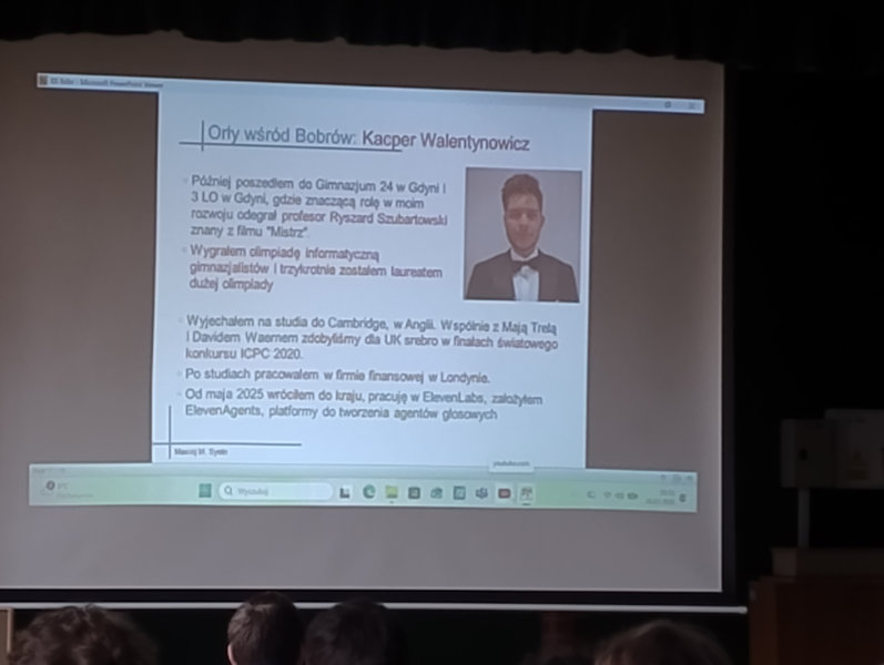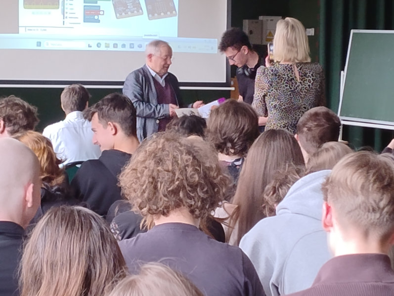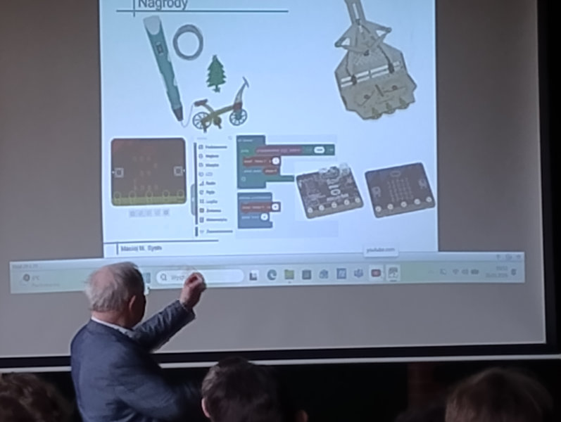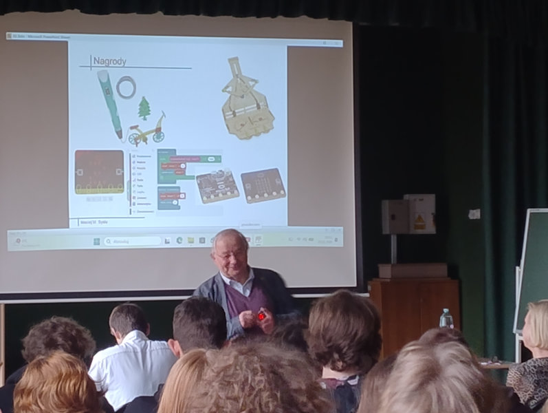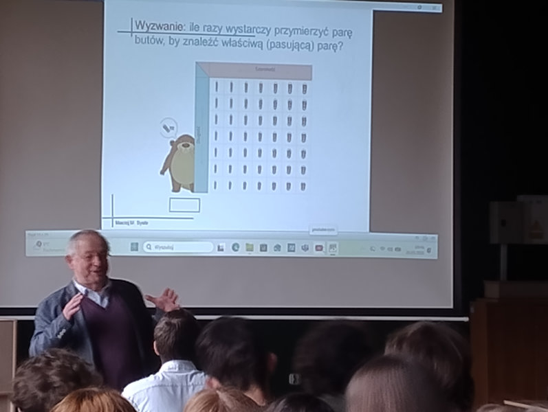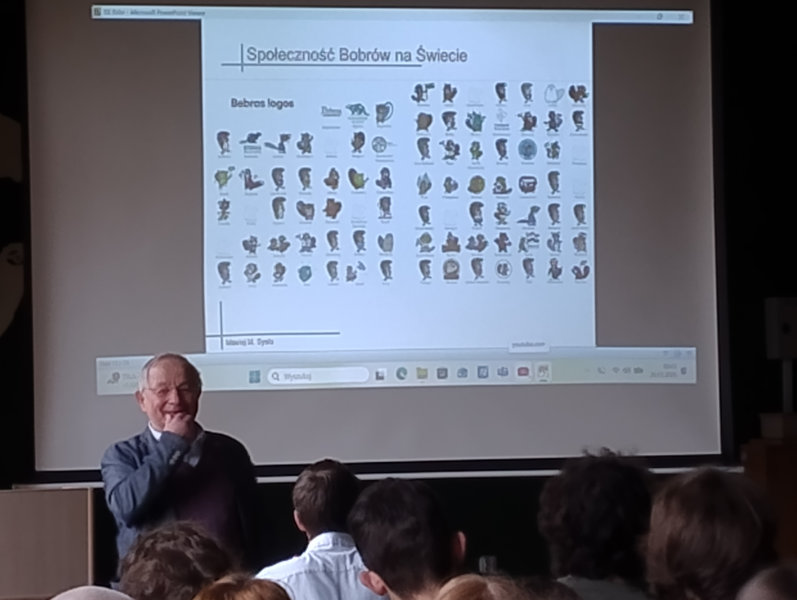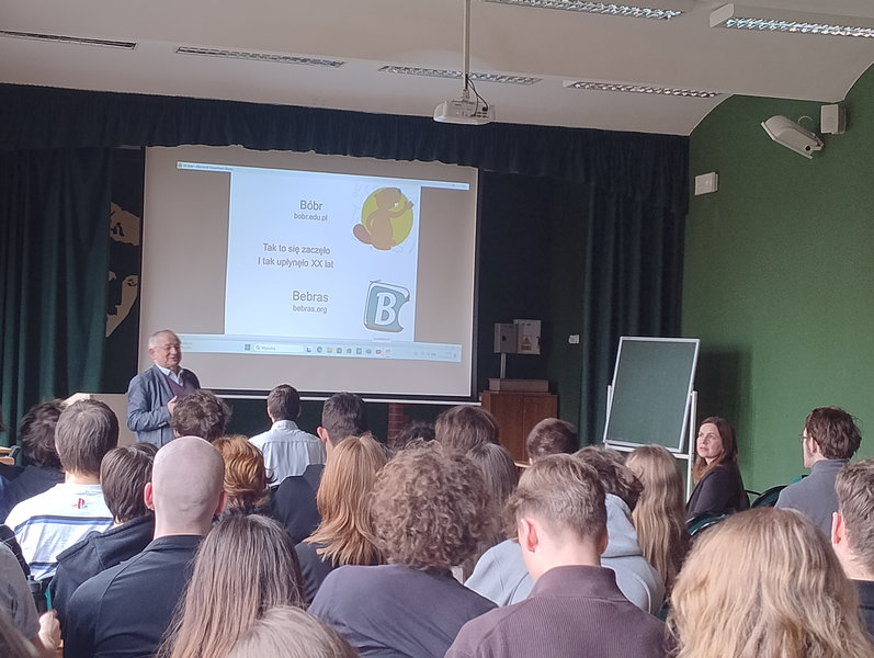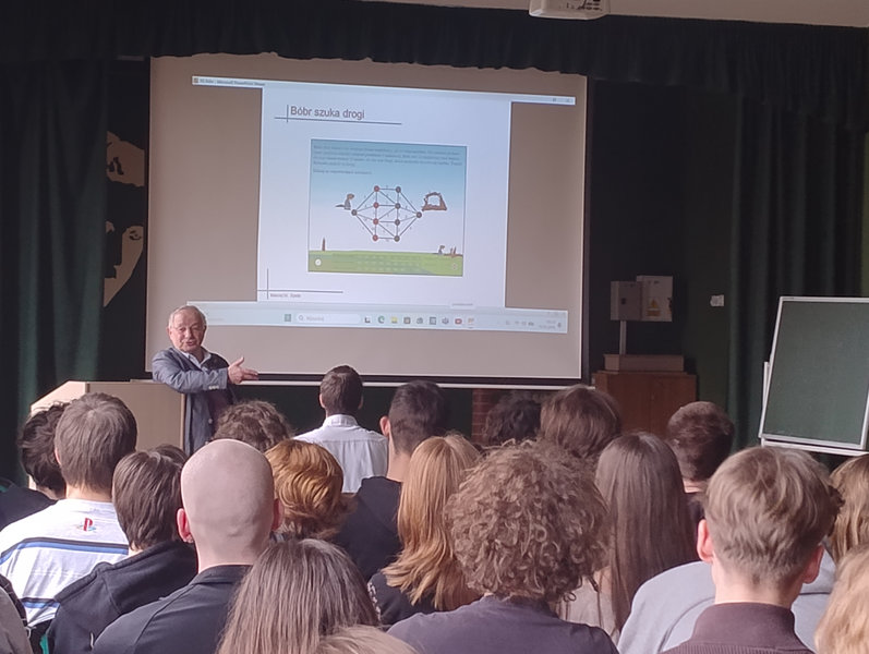 Pan prof. Sysło przybliżył naszym uczniom historię Międzynarodowego Konkursu Informatycznego Bóbr, przedstawił ciekawą prezentację, omówił także wybrane zadania konkursowe.