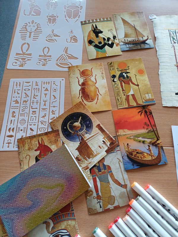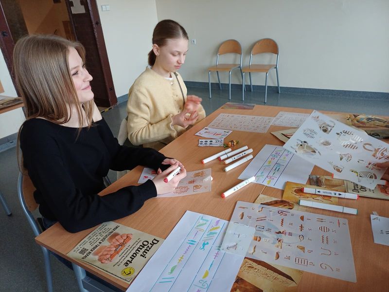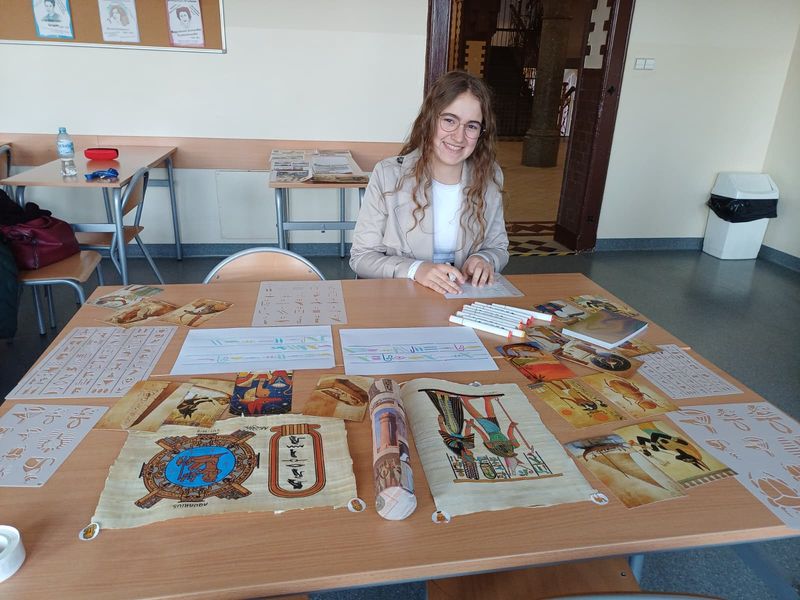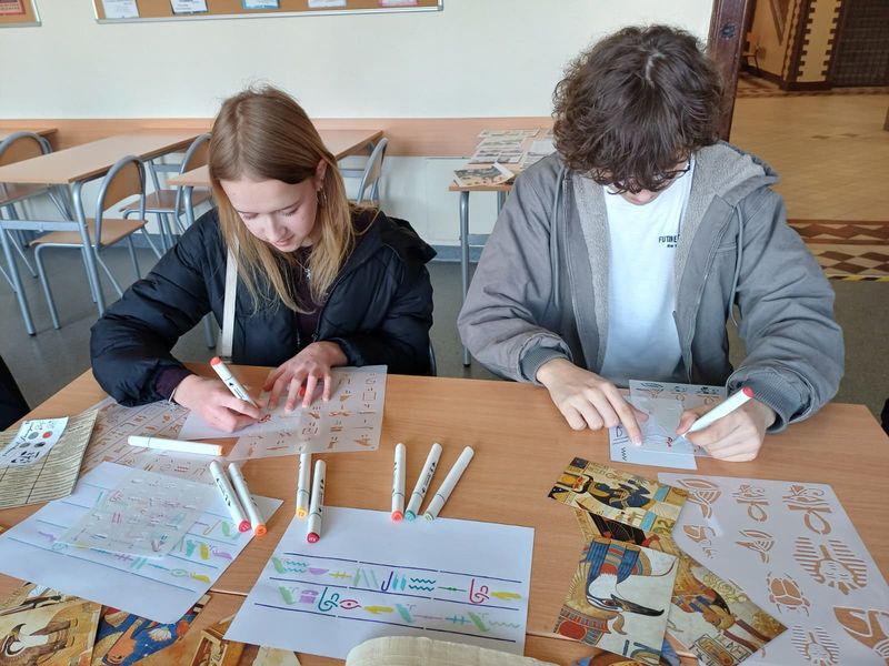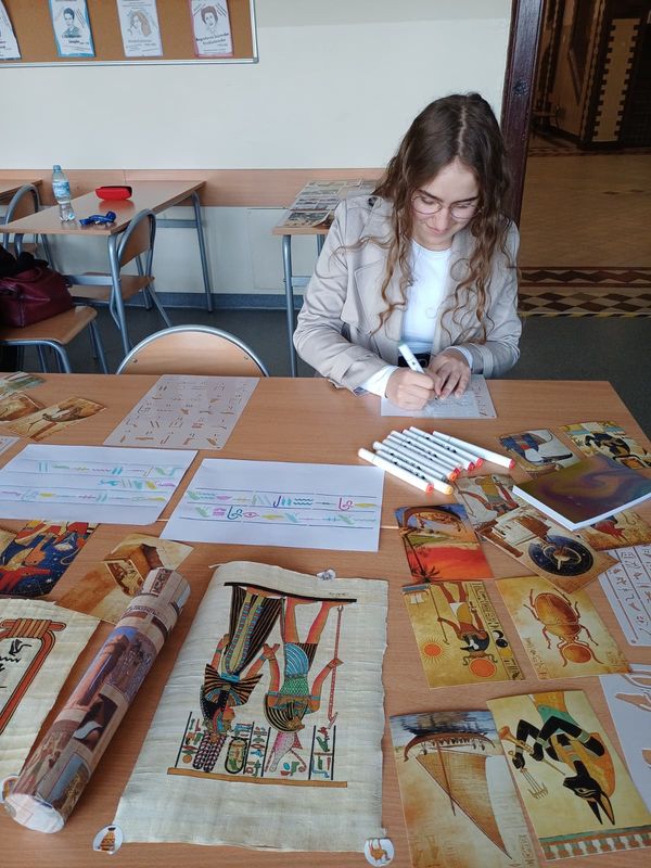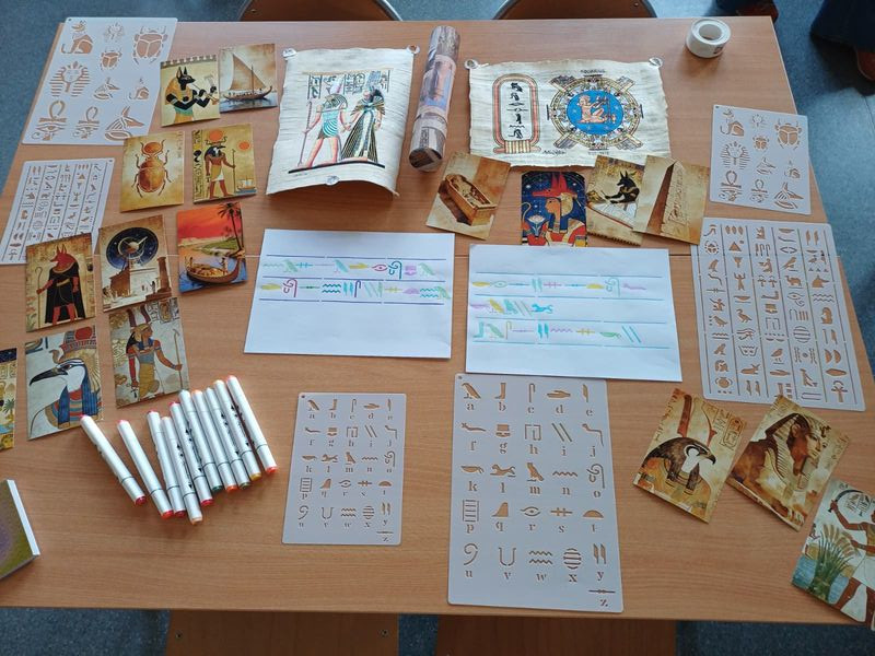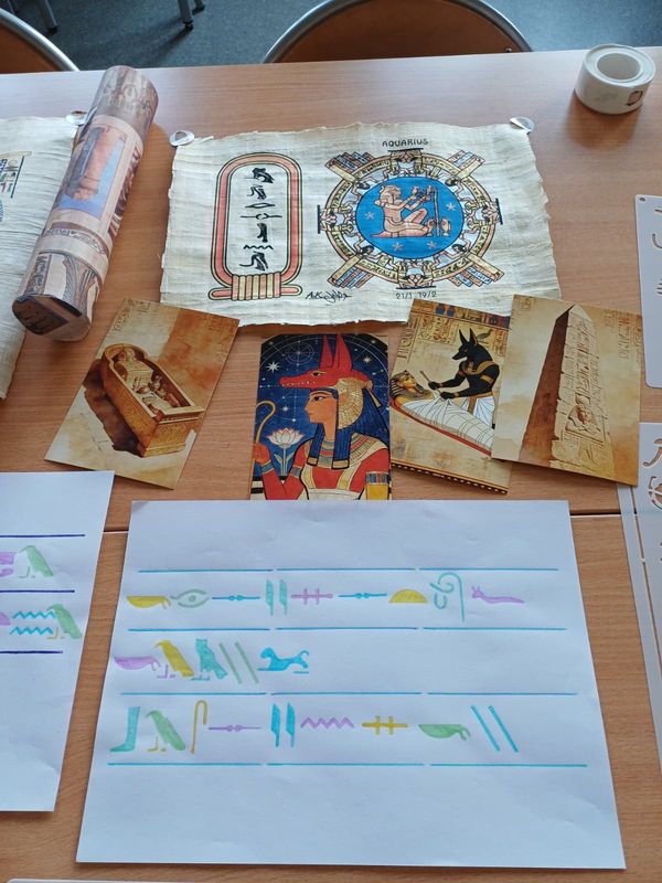Dużą przyjemność i frajdę sprawiła naszym młodym gościom możliwość napisania swojego imienia z wykorzystaniem egipskich hieroglifów, przy użyciu pomocy przygotowanych przez nauczycieli.